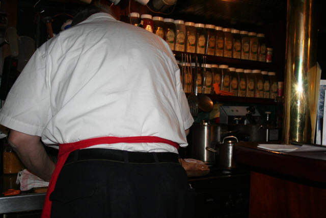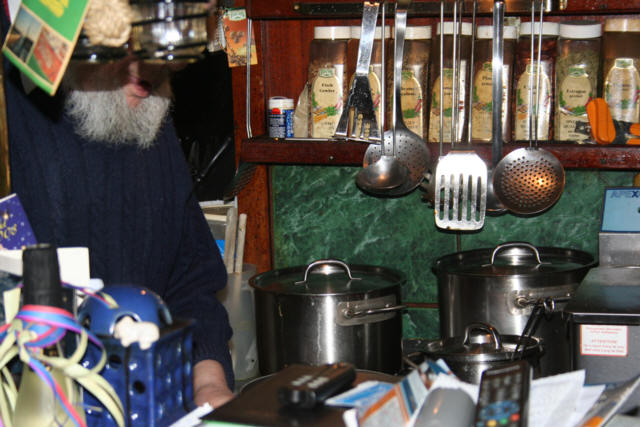 Der Kapitän und Koch. Es gab Rotbarschfilet an Spinat mit Heidekartoffeln und Salat.